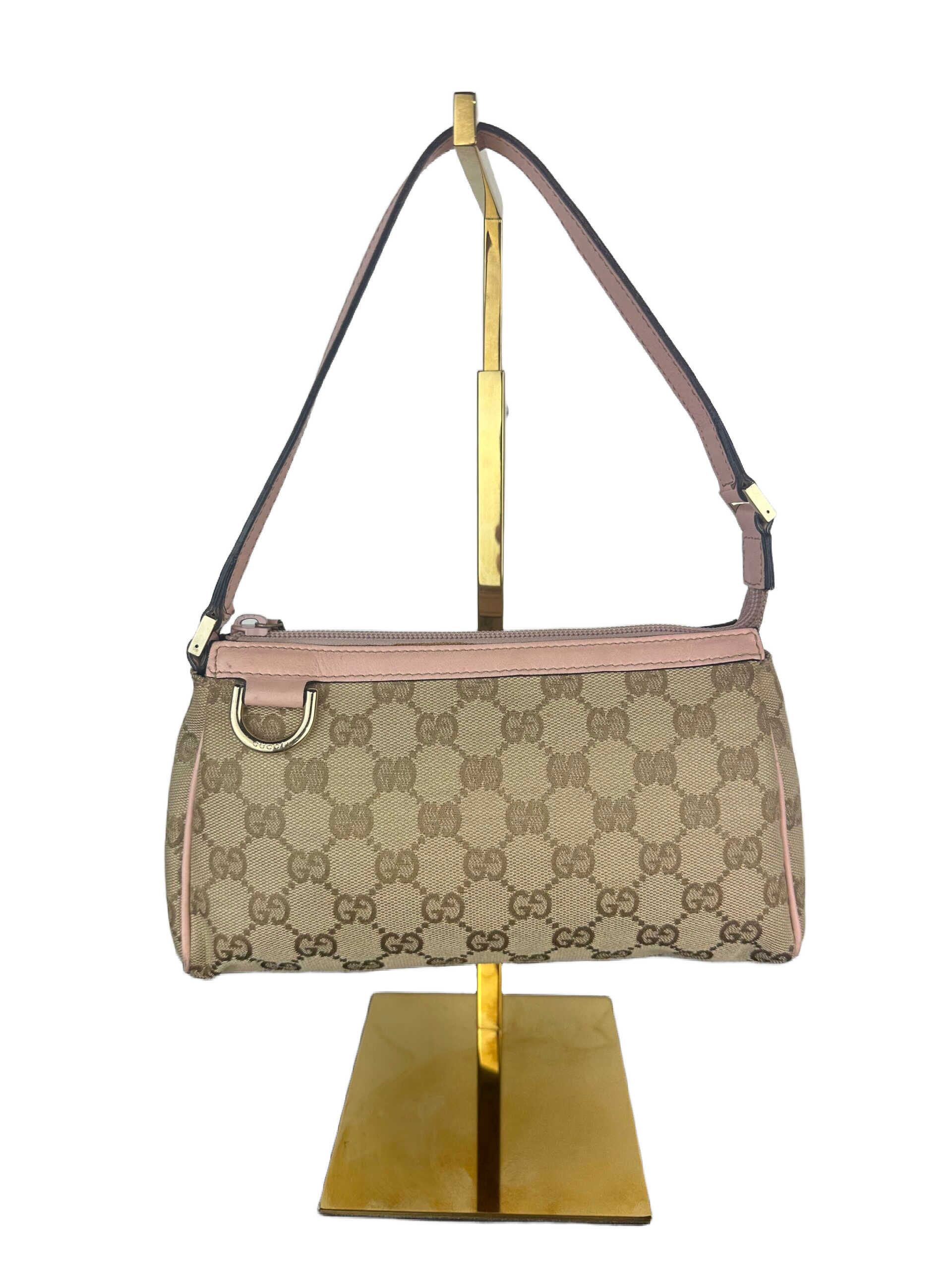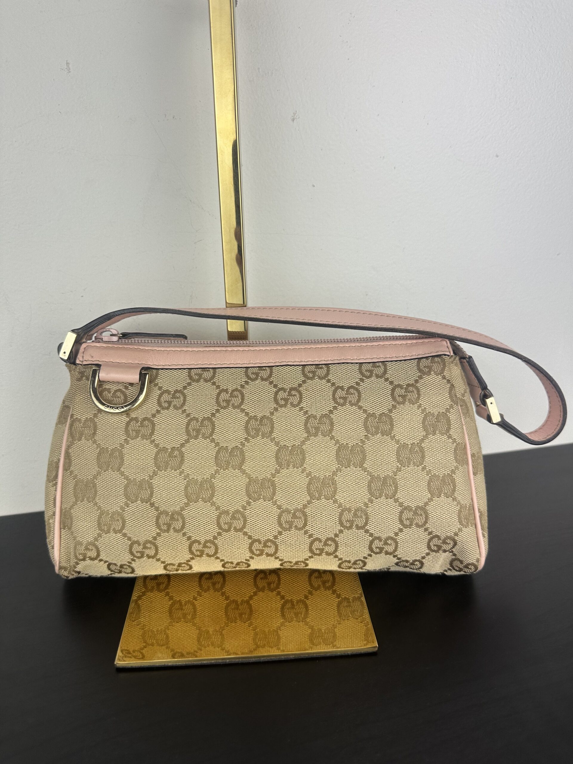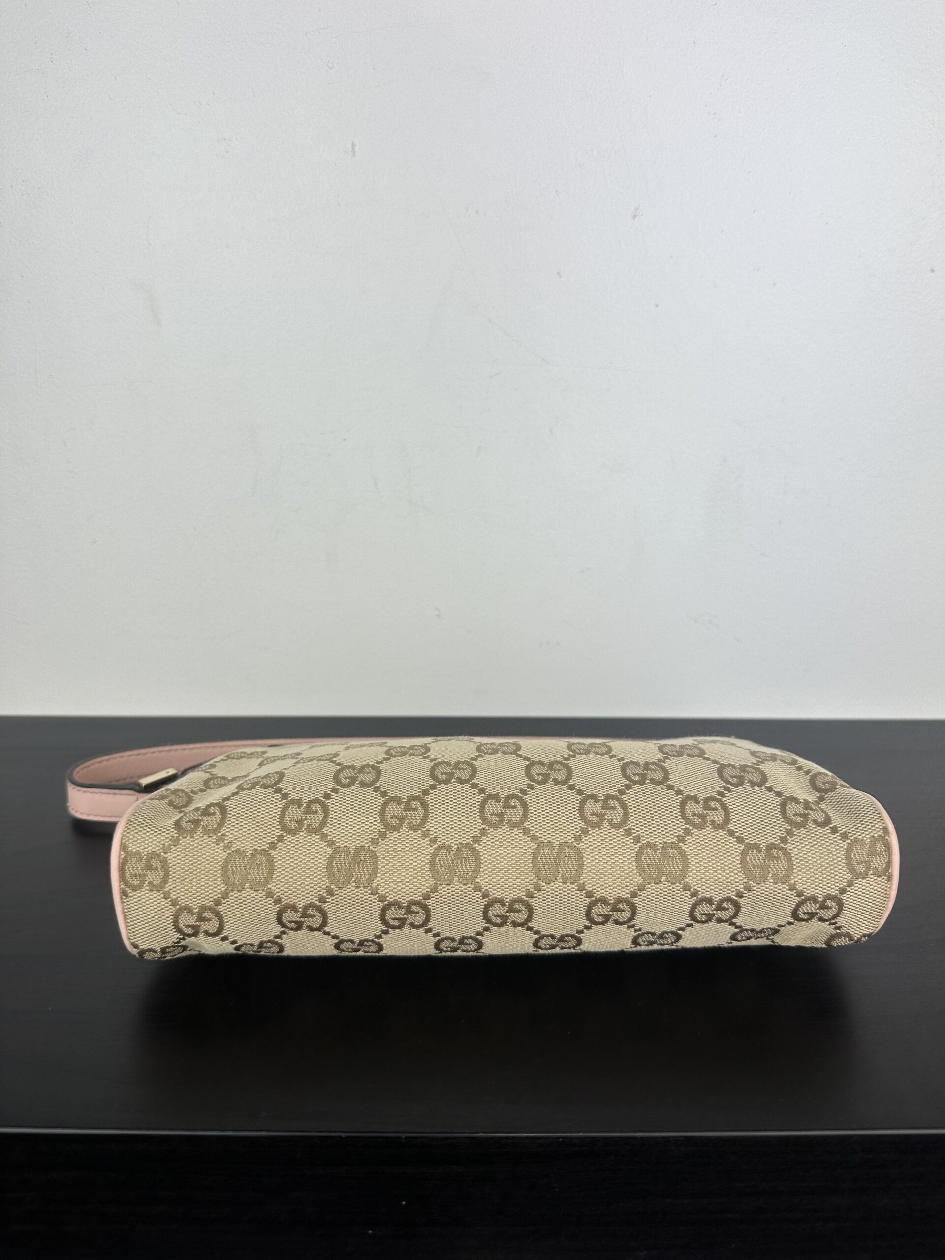 Bolso Gucci Pochette en lona GG Canvas beige con detalles en cuero rosa.