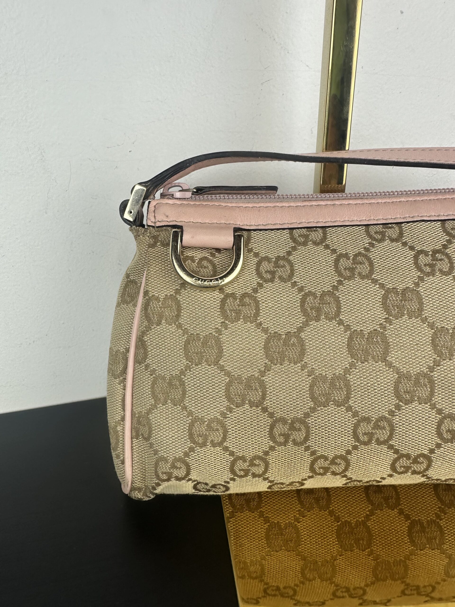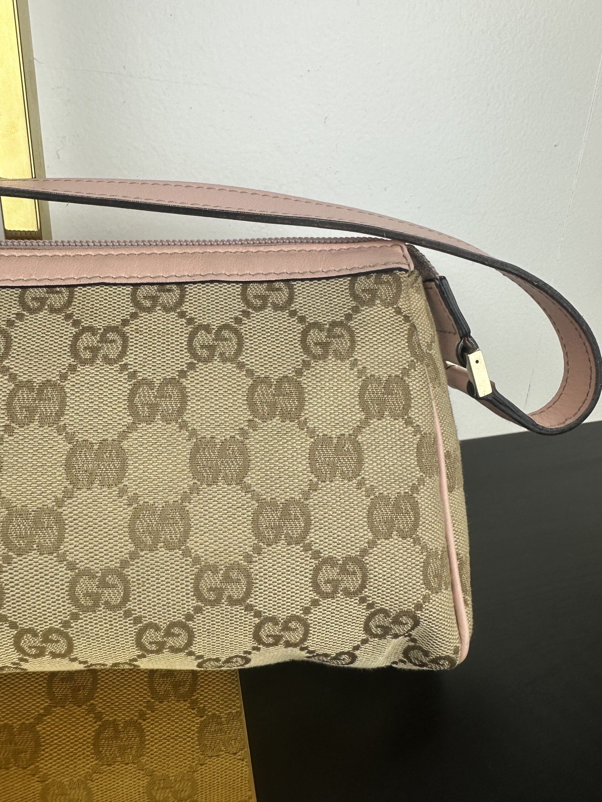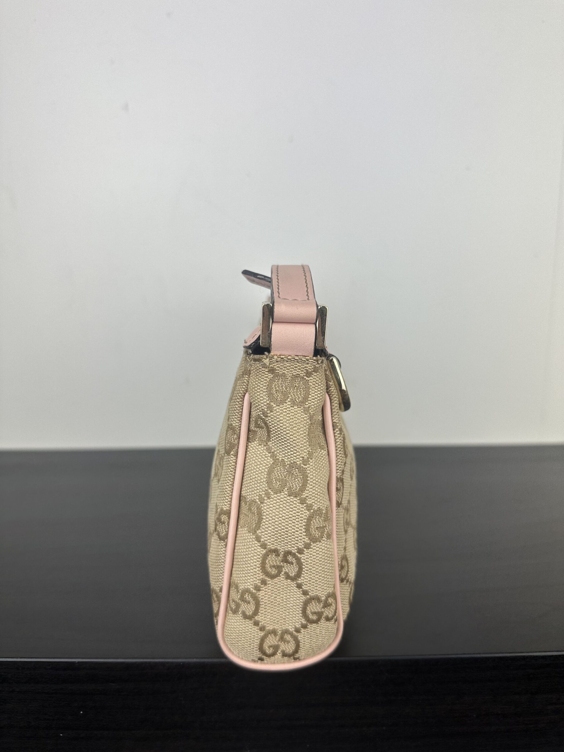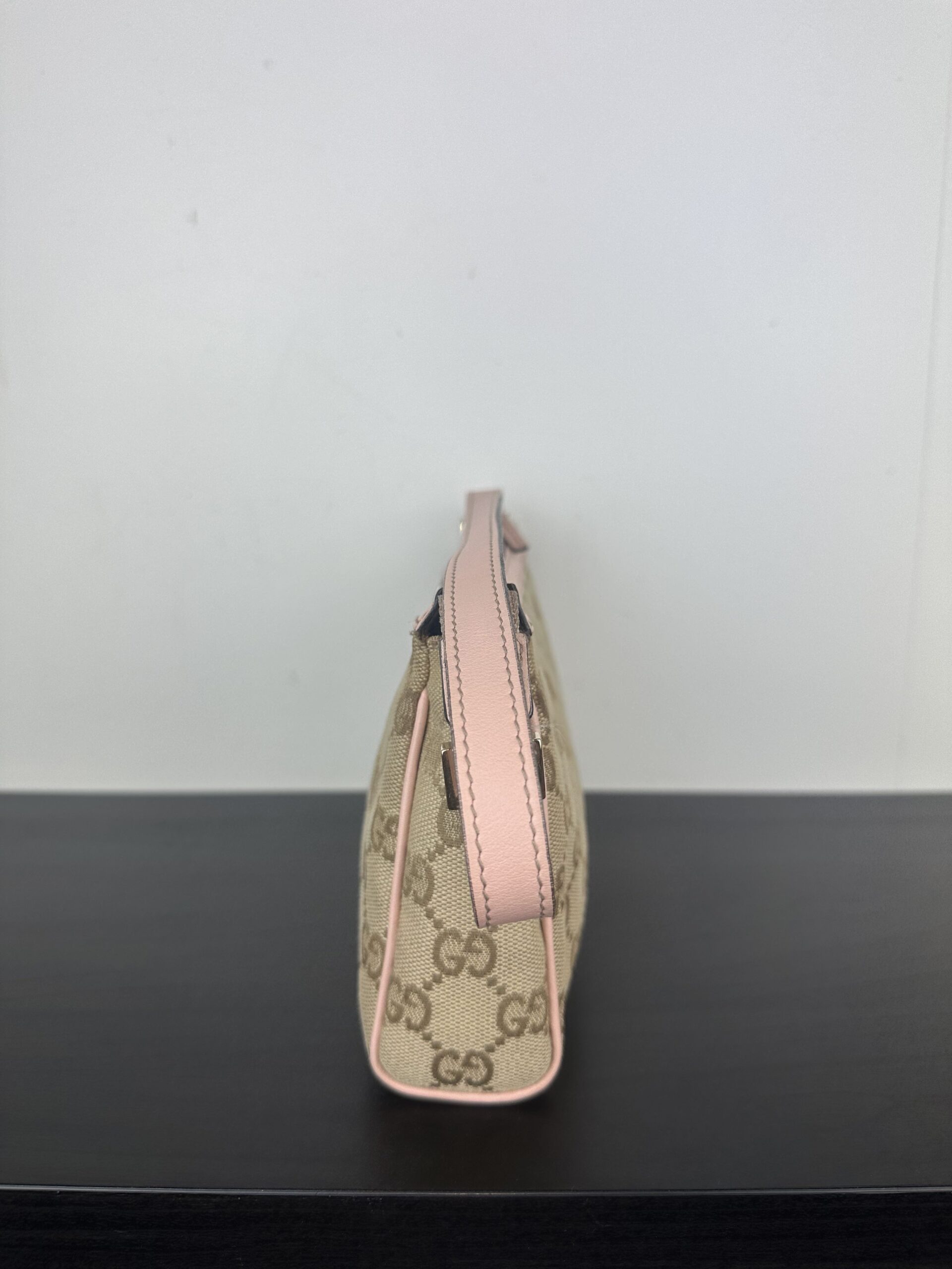 Bolso Gucci Pochette en lona GG Canvas beige con detalles en cuero rosa.