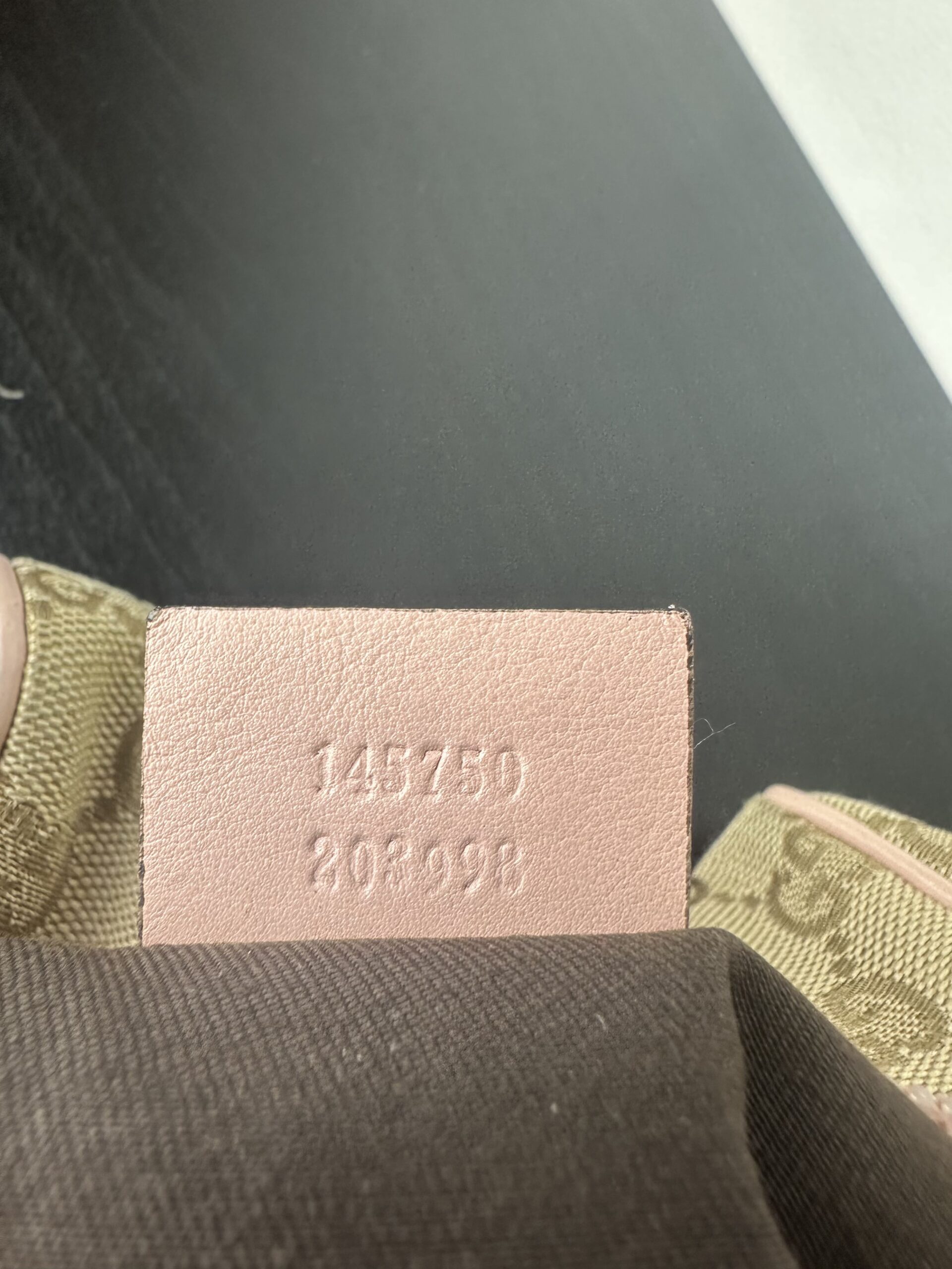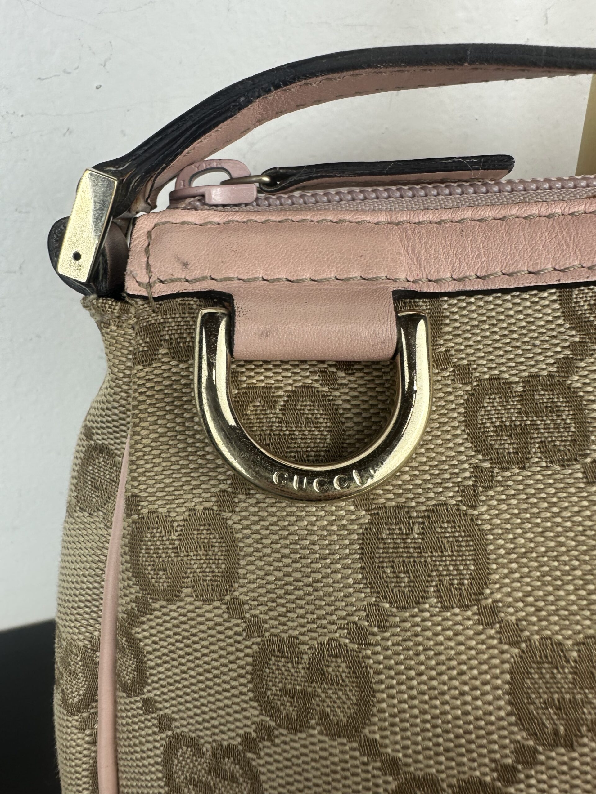 Materiales: Lona GG canvas beige y piel rosa