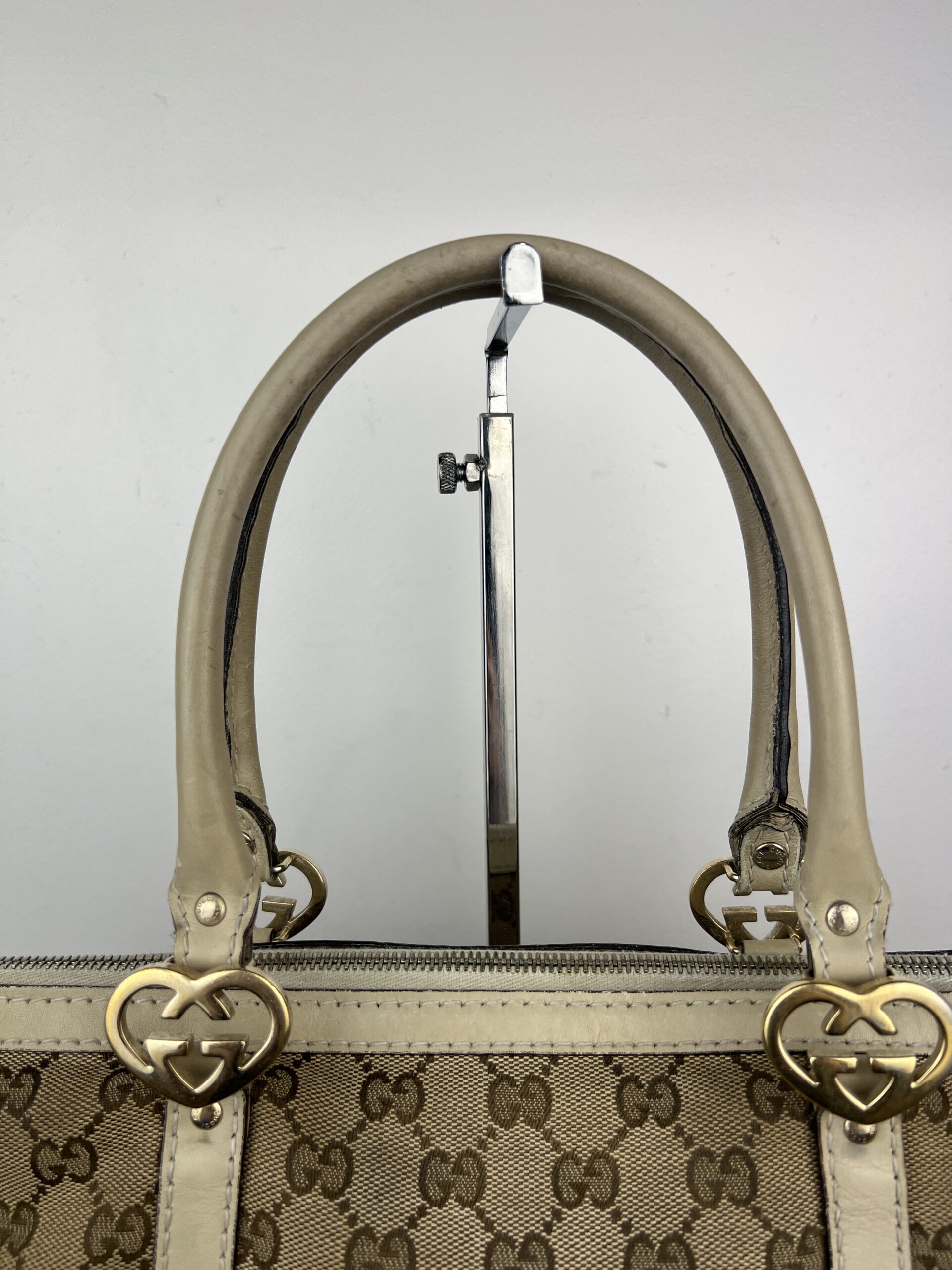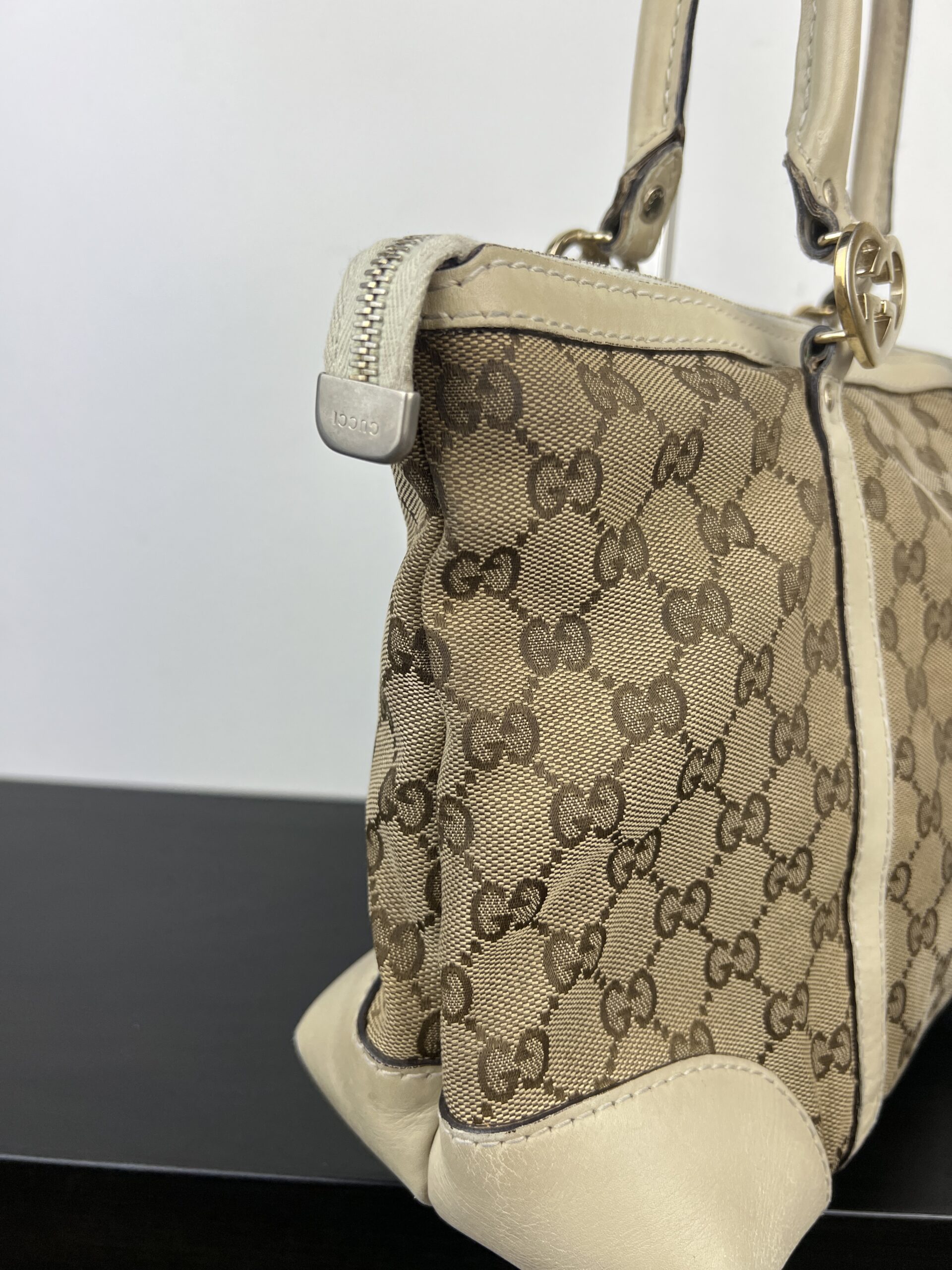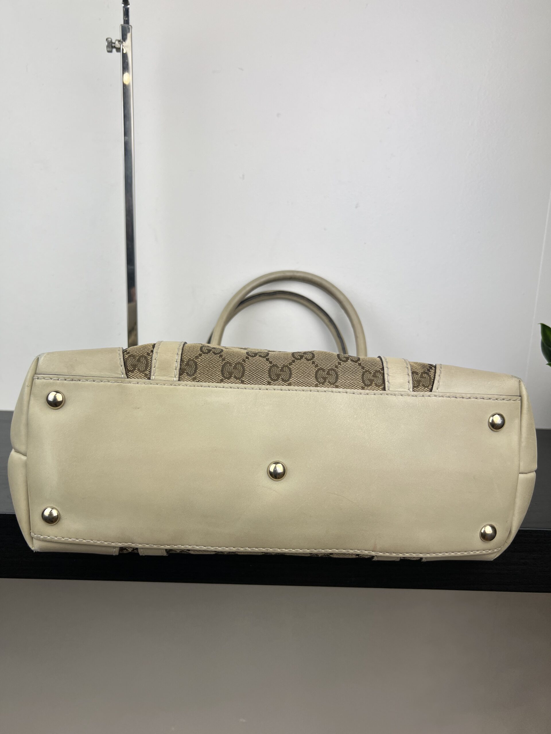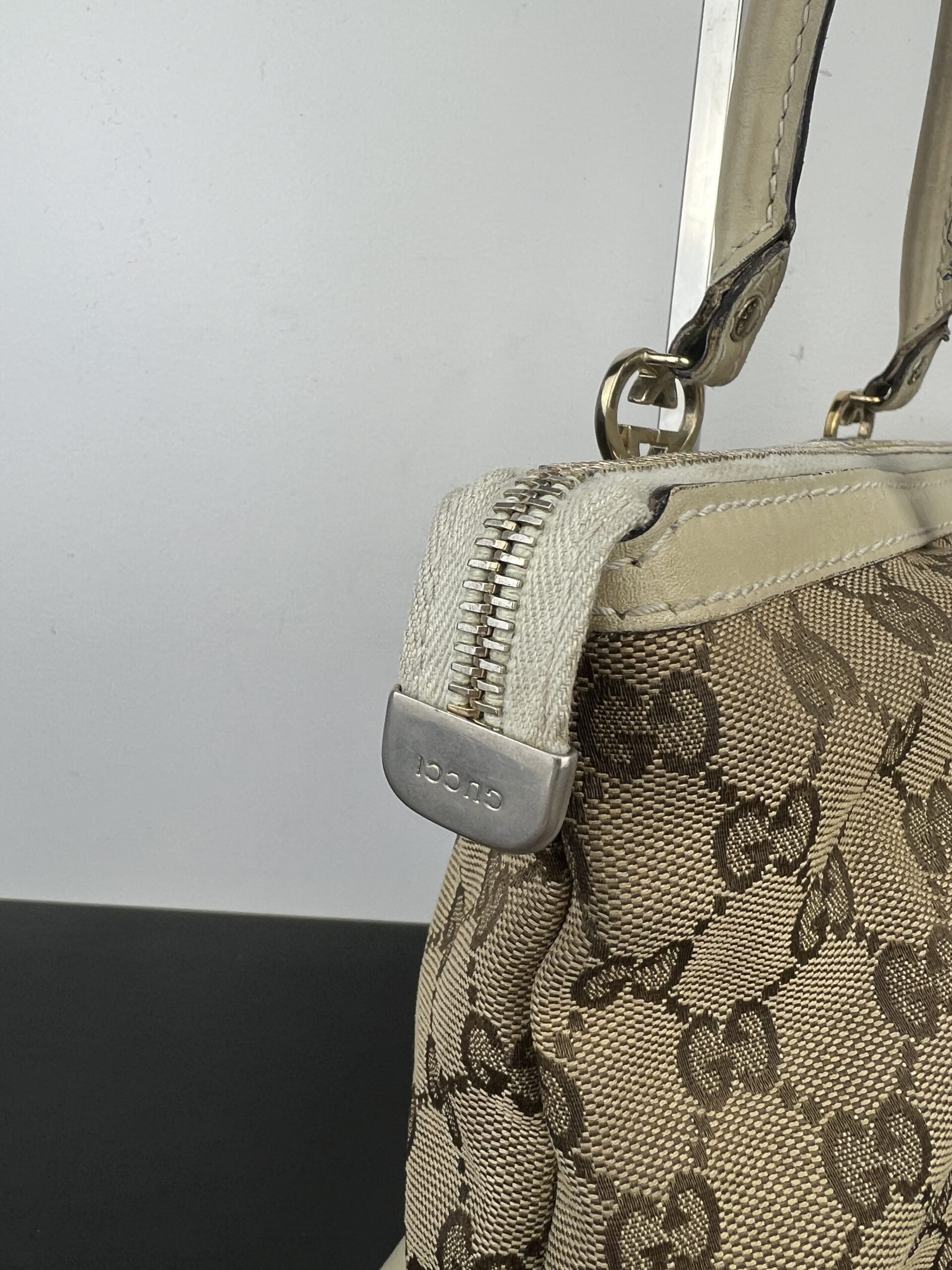 Bolso Gucci GG Canvas confeccionado en lona beige con el monograma GG icónico presente en todo el bolso, combinado con detalles en cuero color crema y herrajes metálicos dorados con el distintivo logo GG en las anillas de las asas.