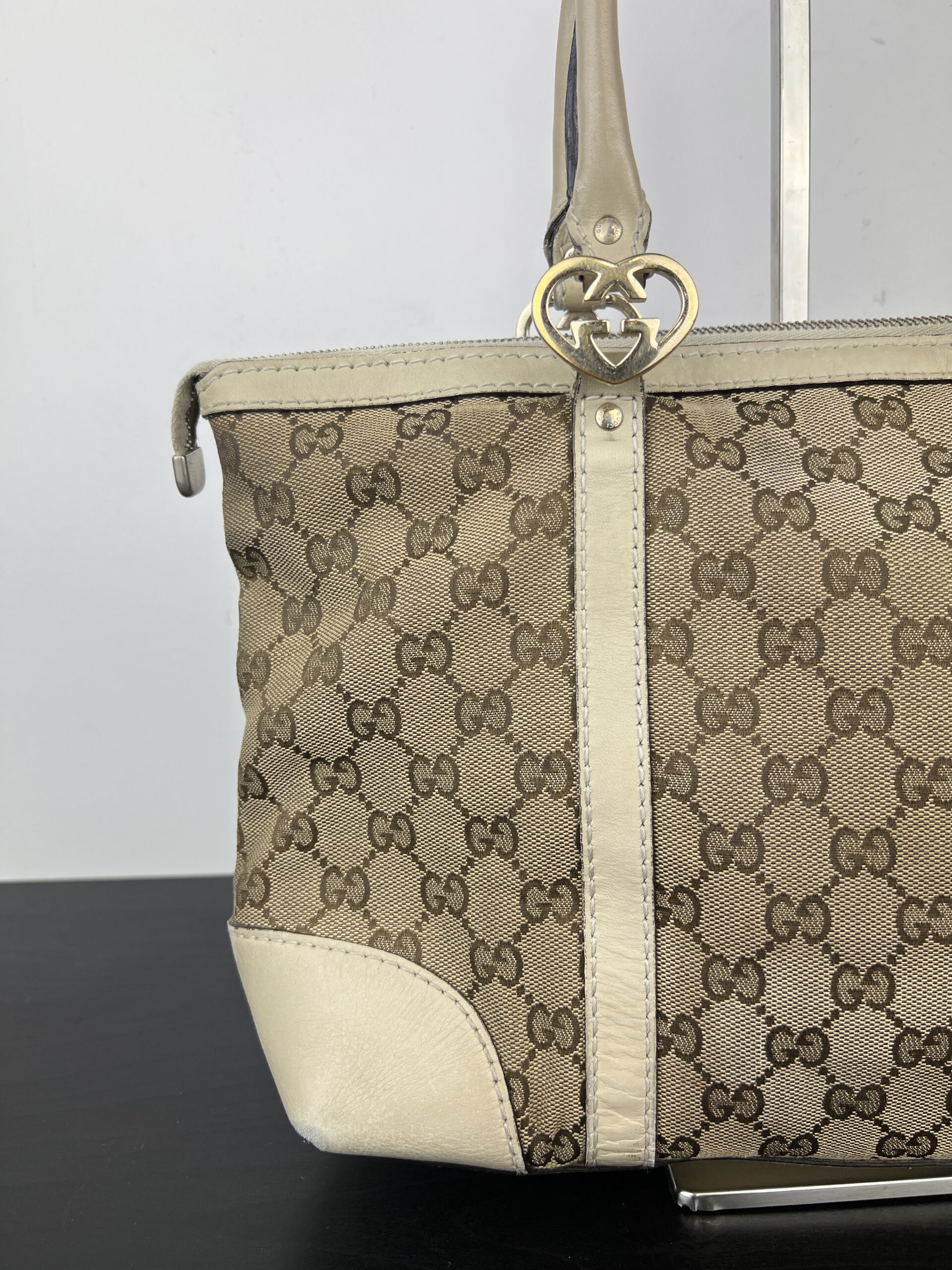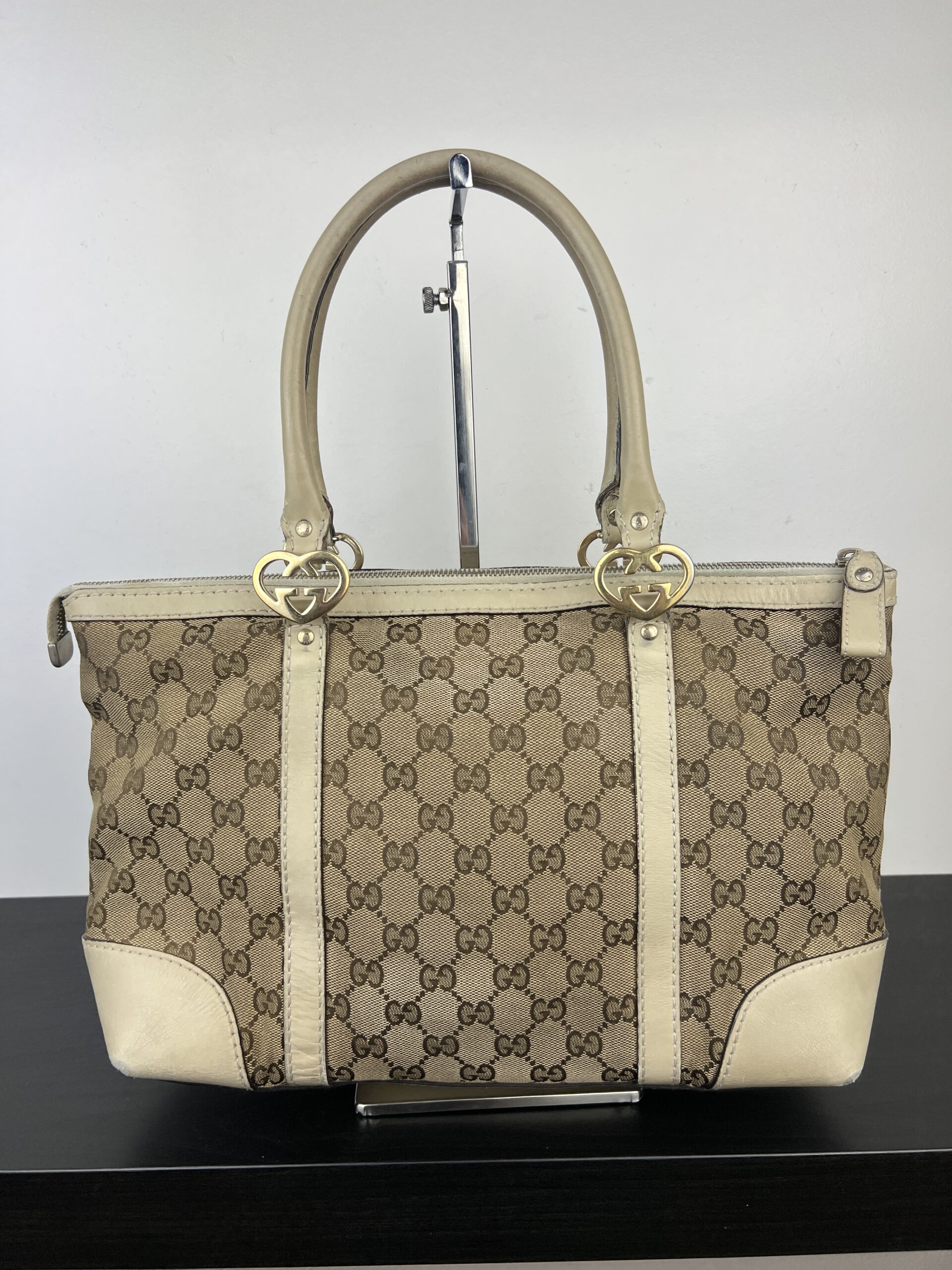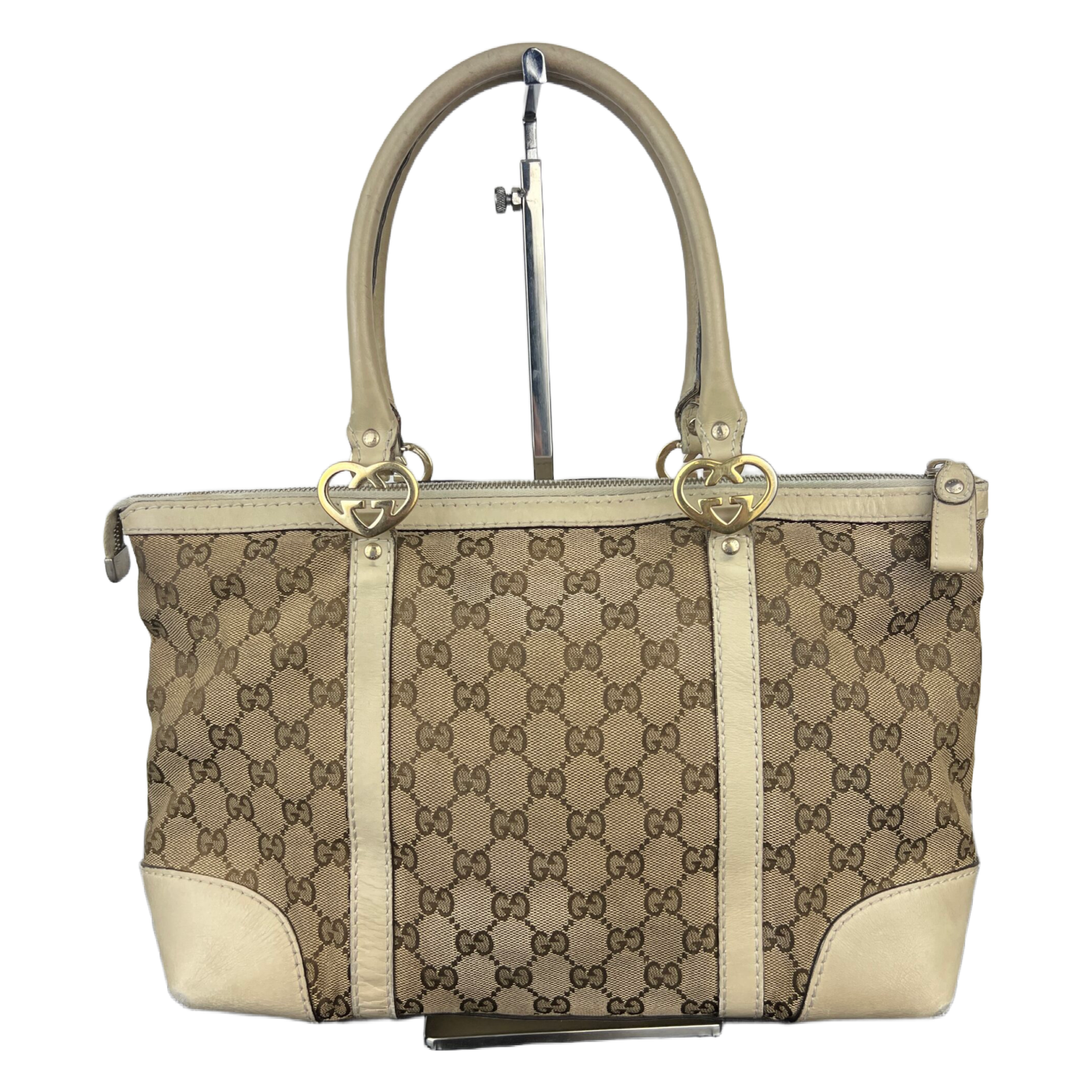 Bolso Gucci GG Canvas confeccionado en lona beige con el monograma GG icónico presente en todo el bolso, combinado con detalles en cuero color crema y herrajes metálicos dorados con el distintivo logo GG en las anillas de las asas.