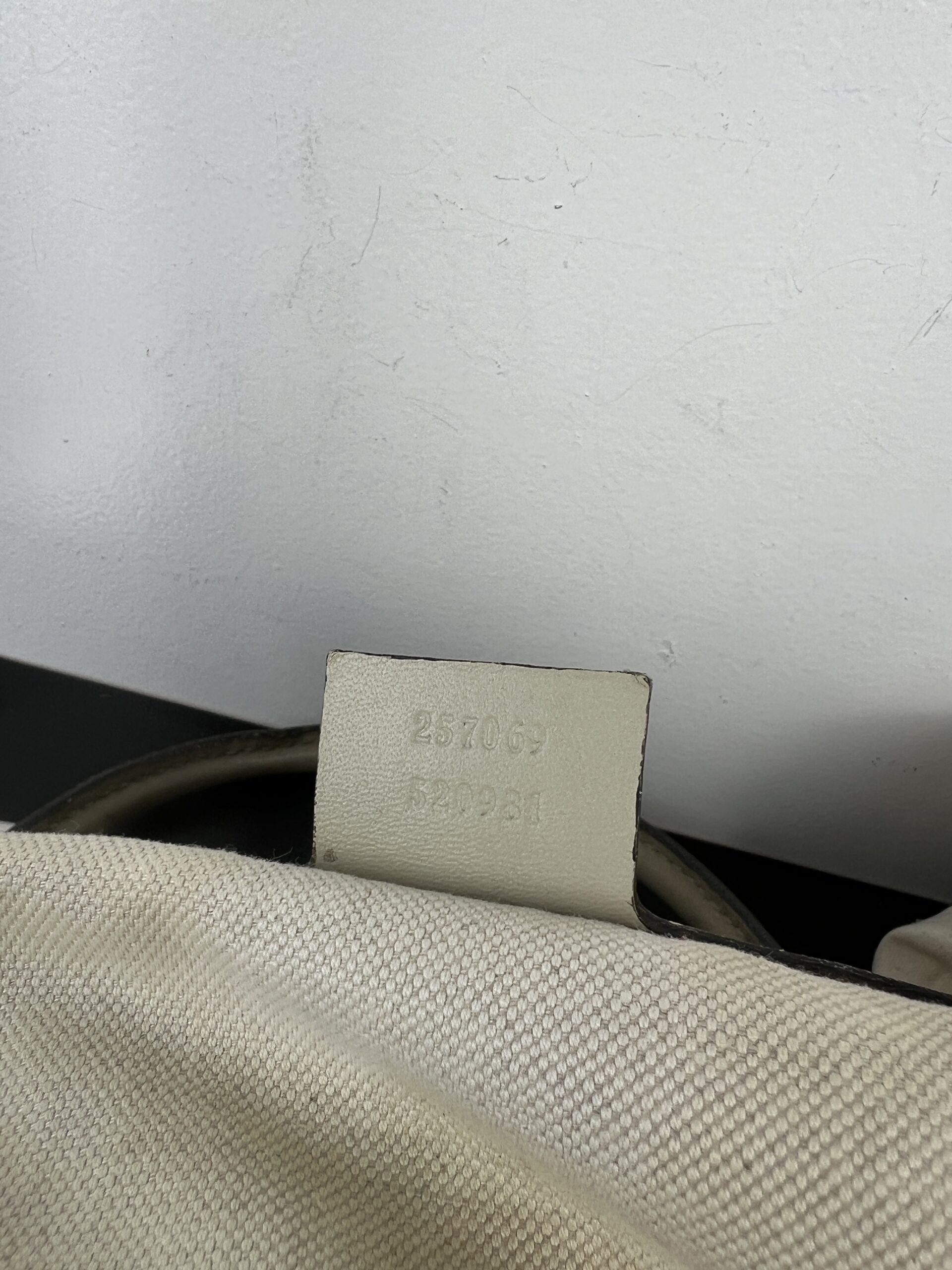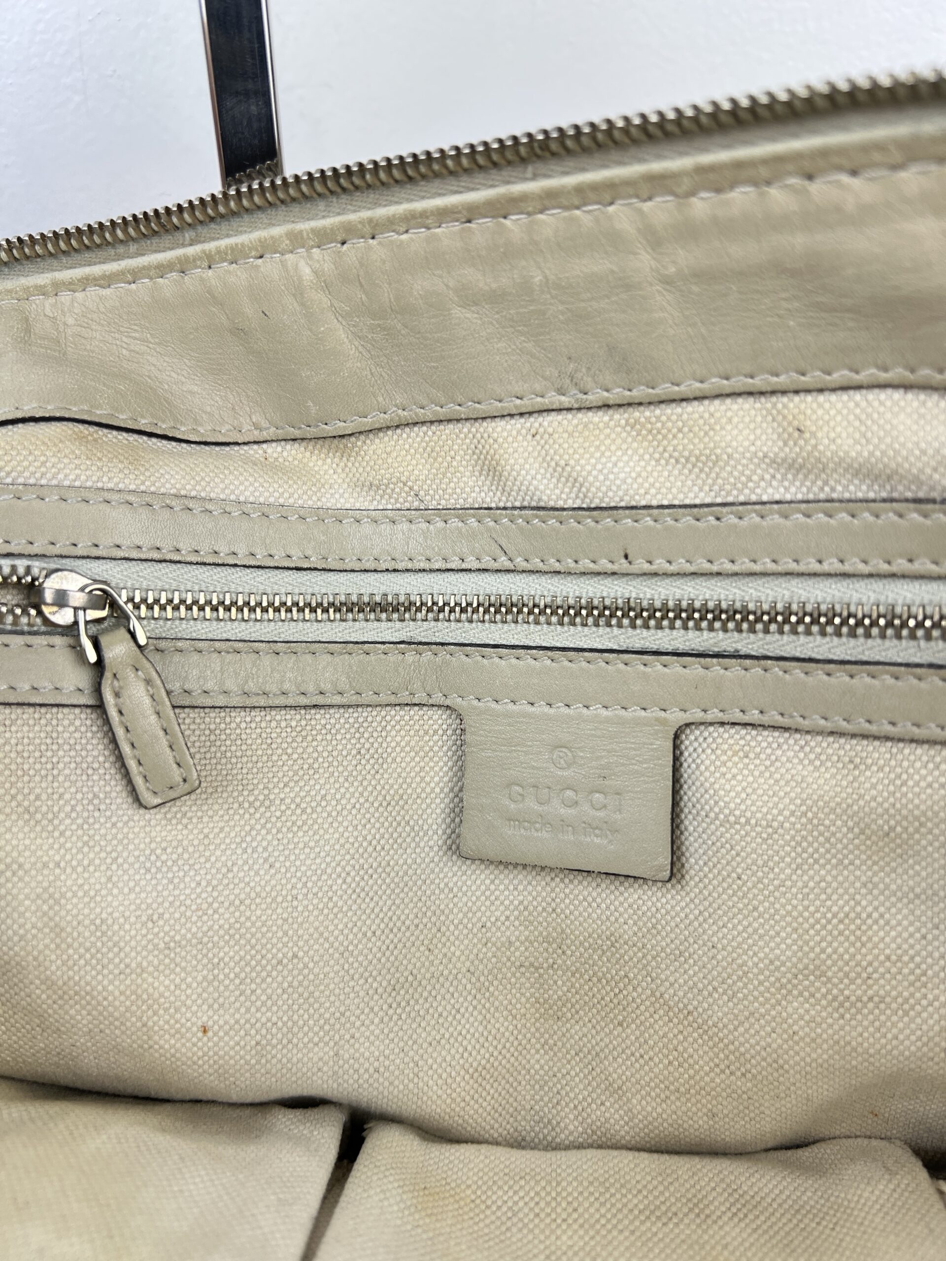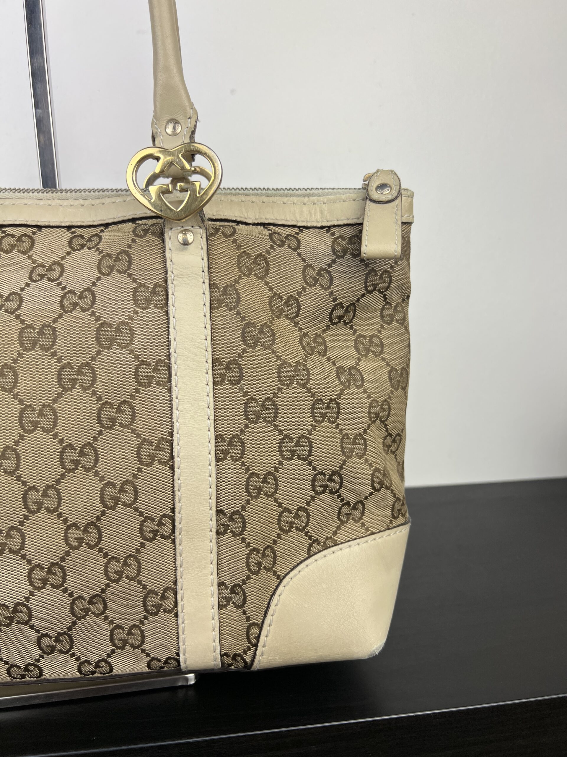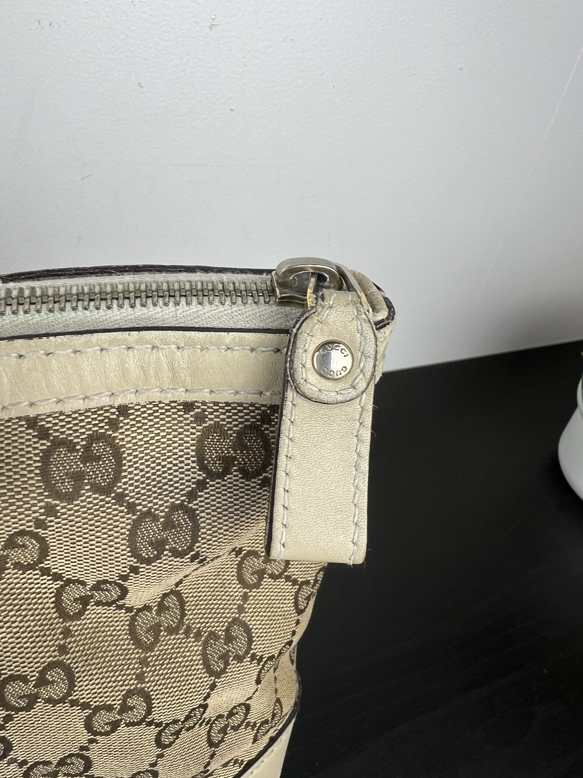 Bolso Gucci GG Canvas confeccionado en lona beige con el monograma GG icónico presente en todo el bolso, combinado con detalles en cuero color crema y herrajes metálicos dorados con el distintivo logo GG en las anillas de las asas.