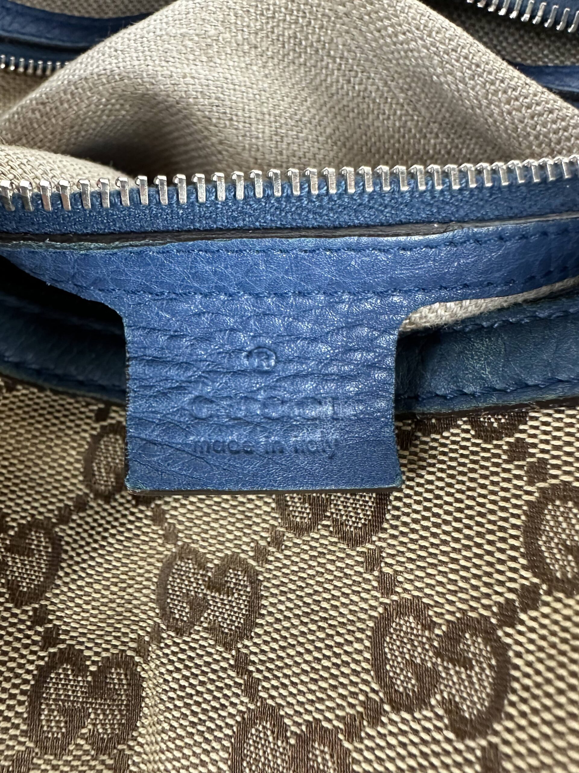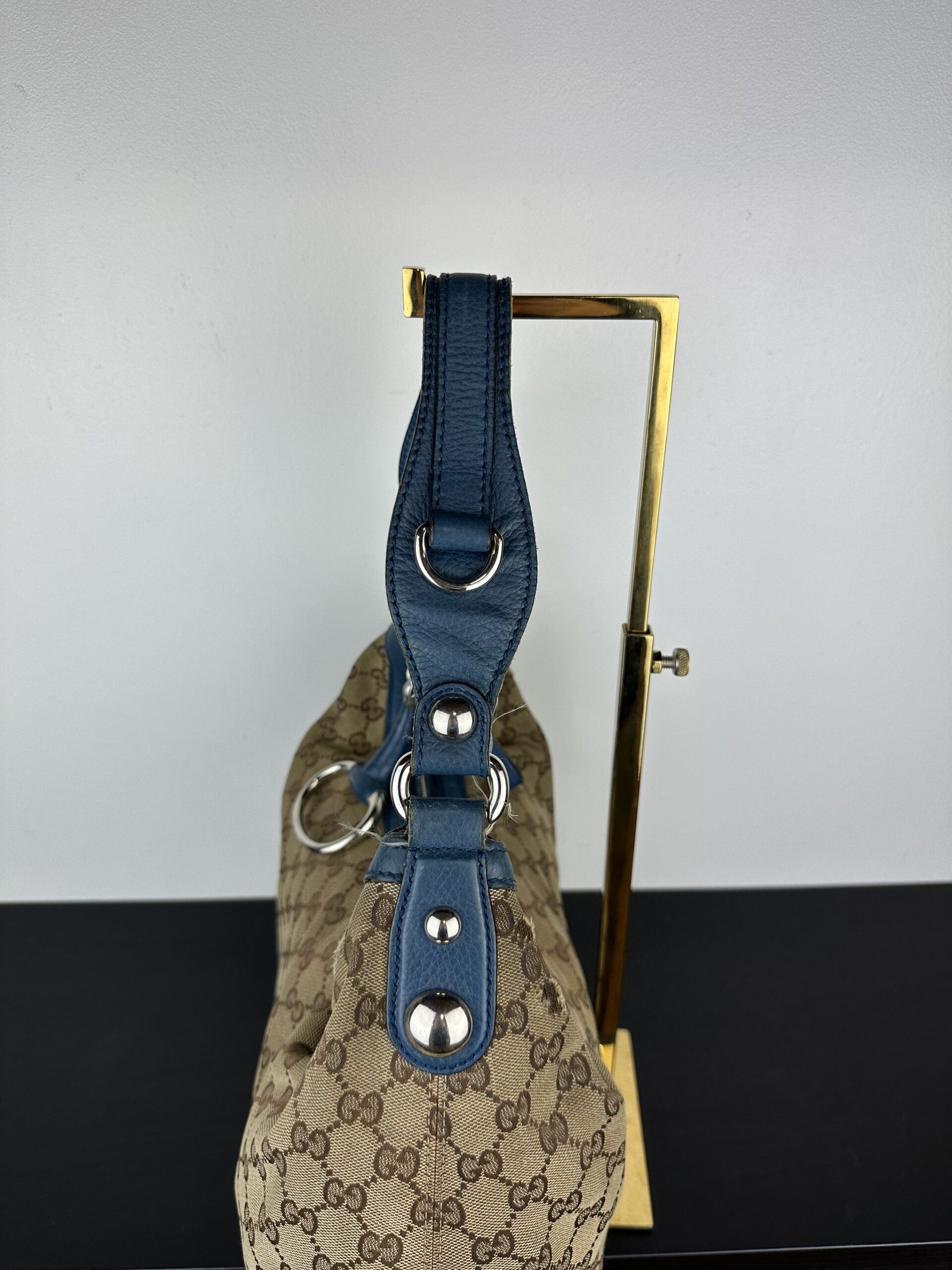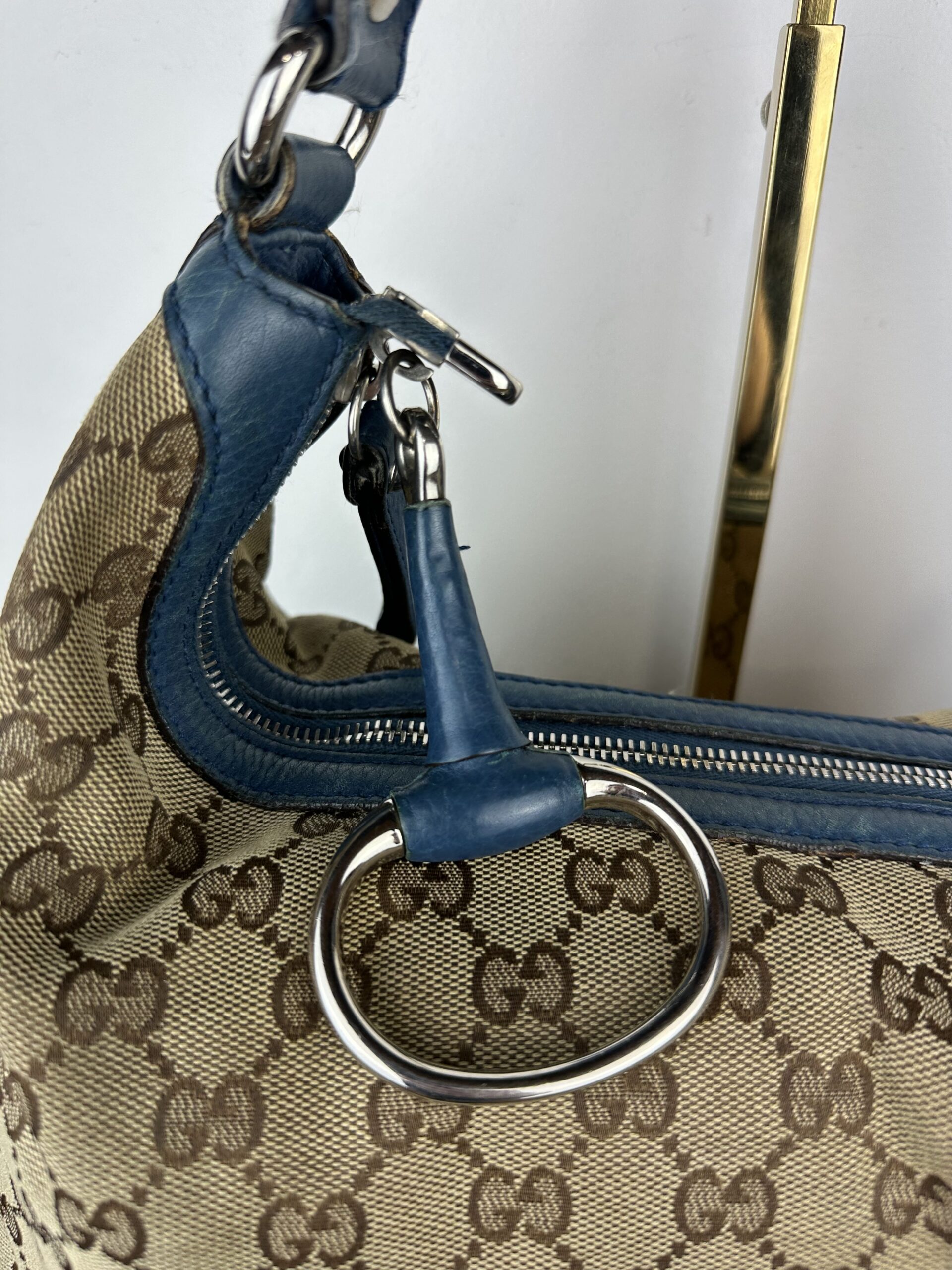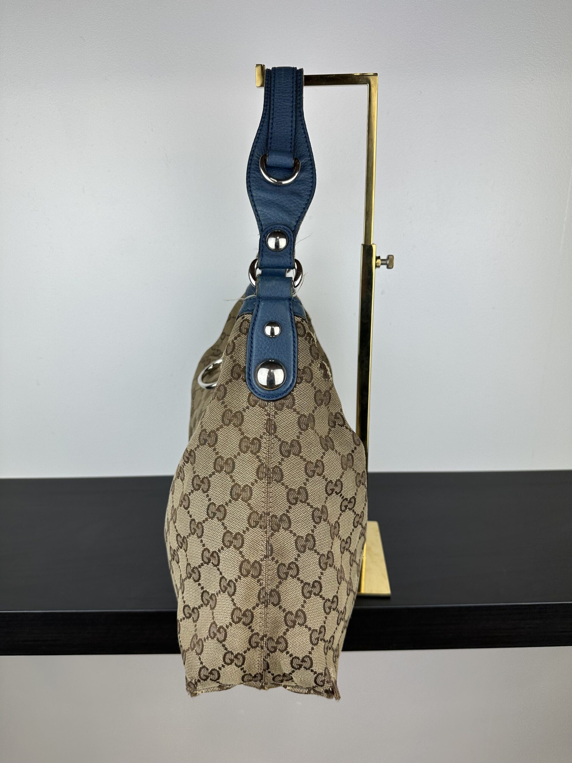 & Free ShippingBolso Gucci Hobo en lona GG canvas beige con detalles en piel azul.