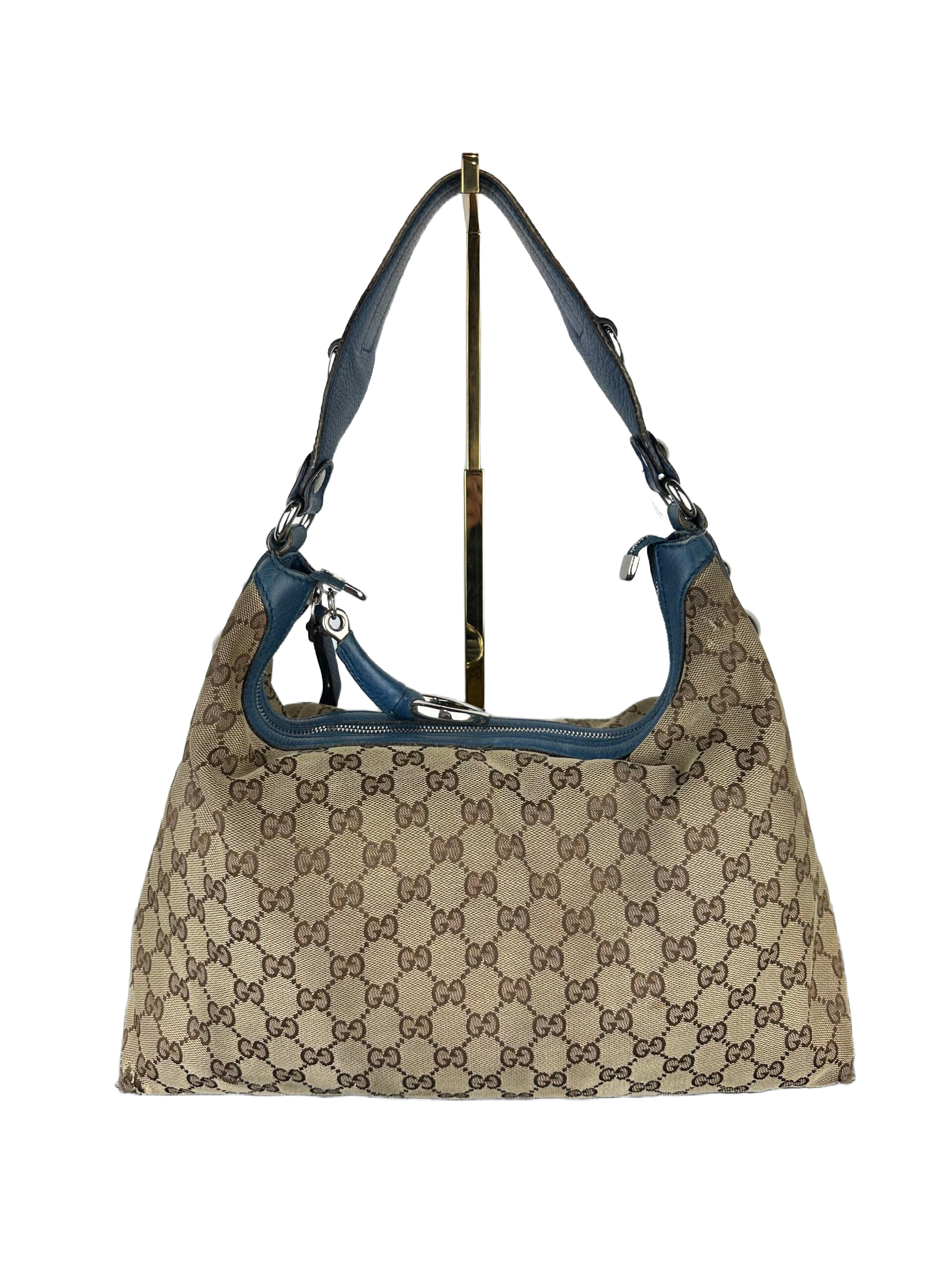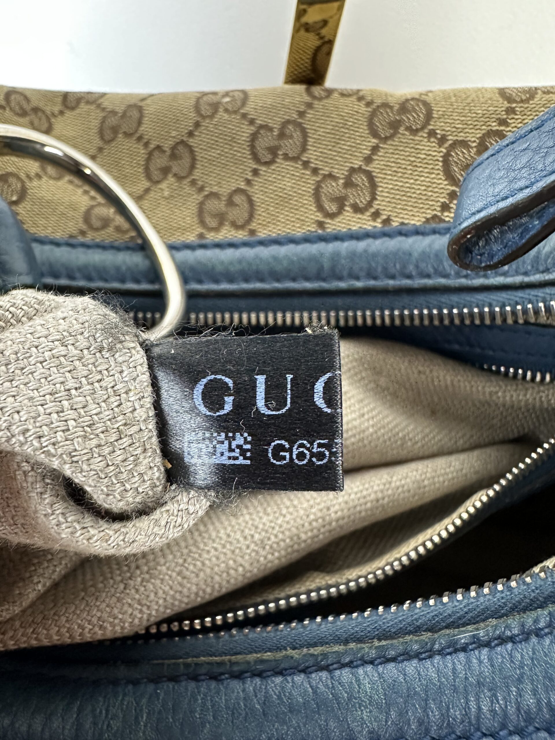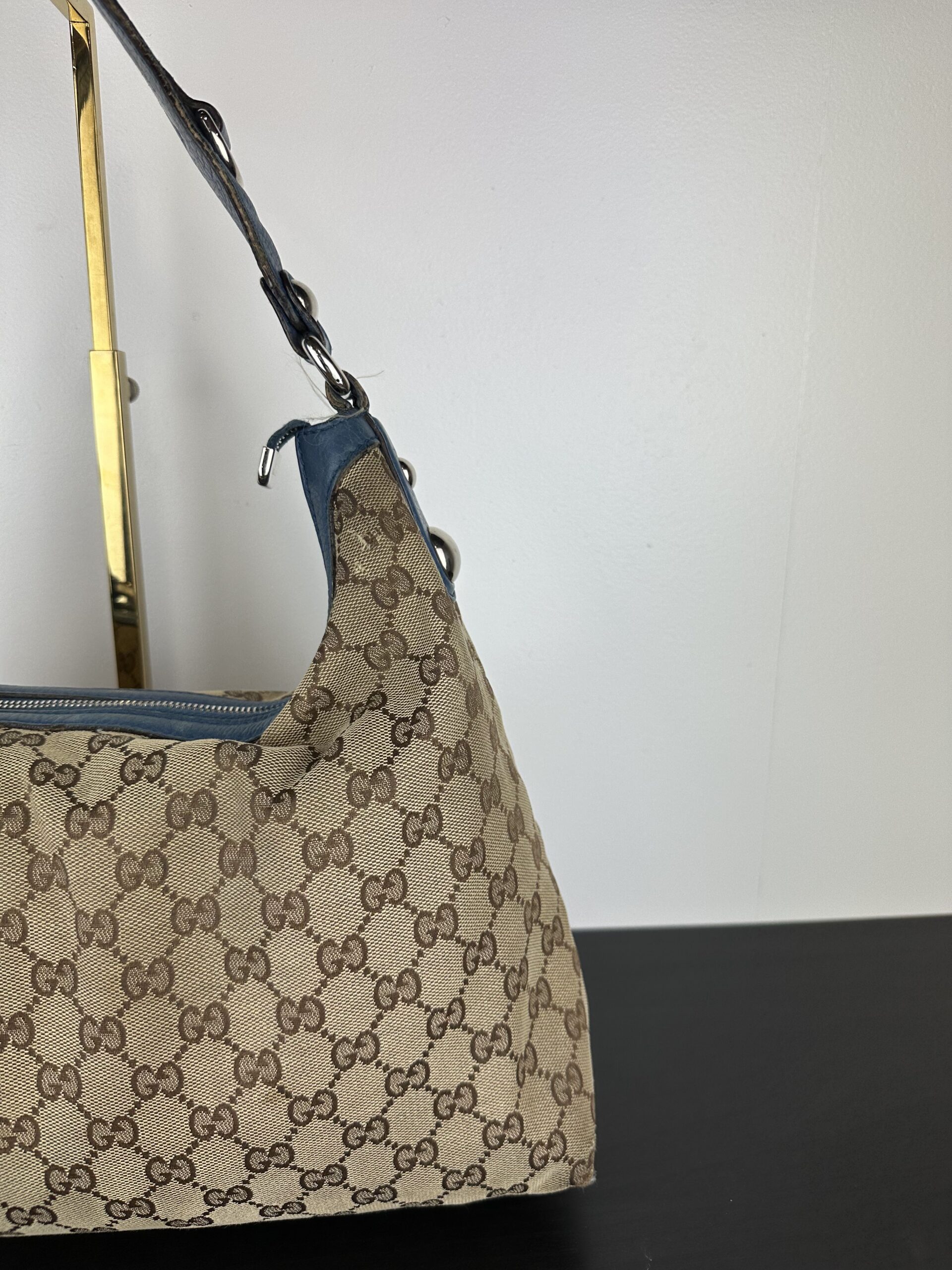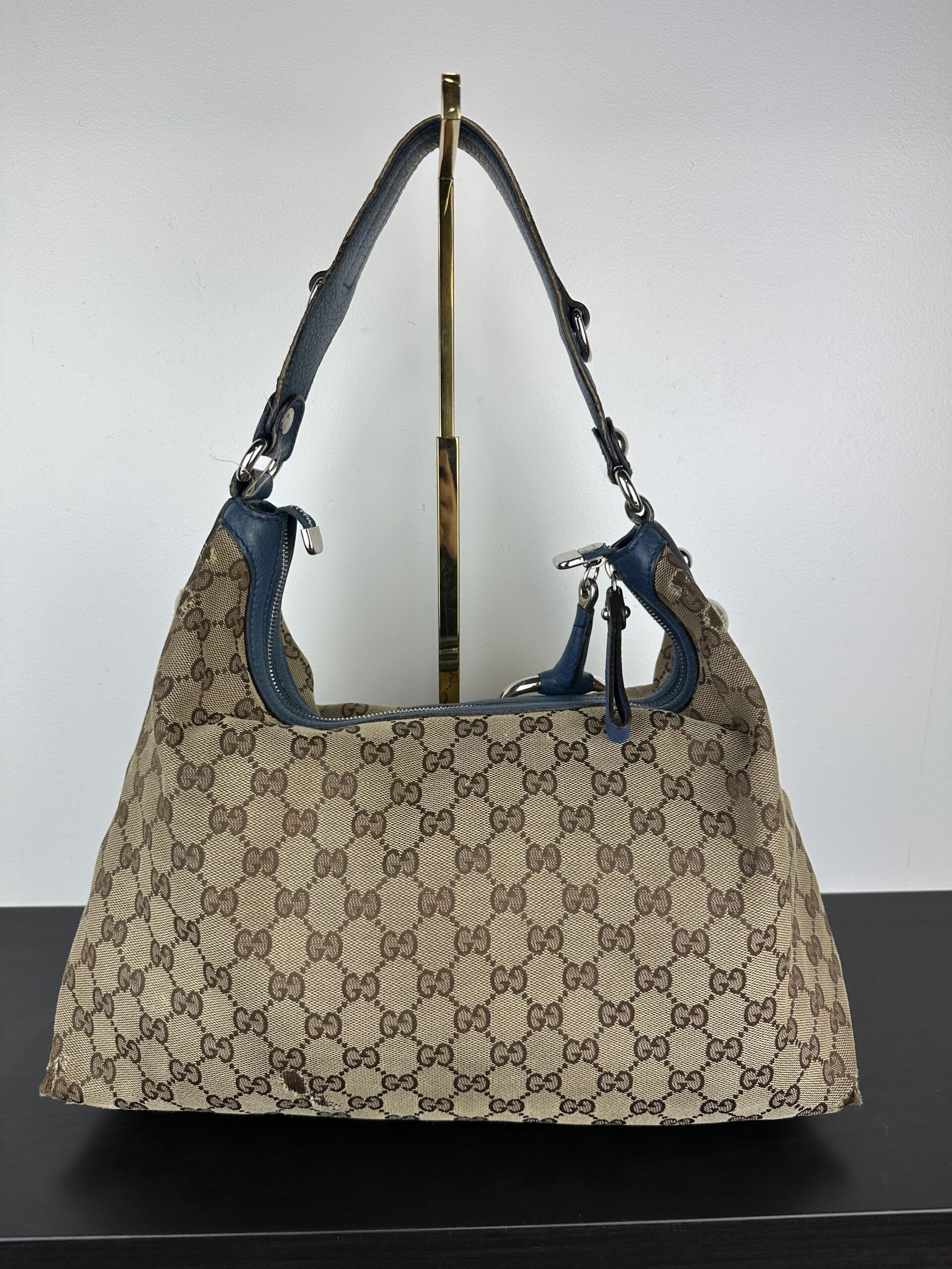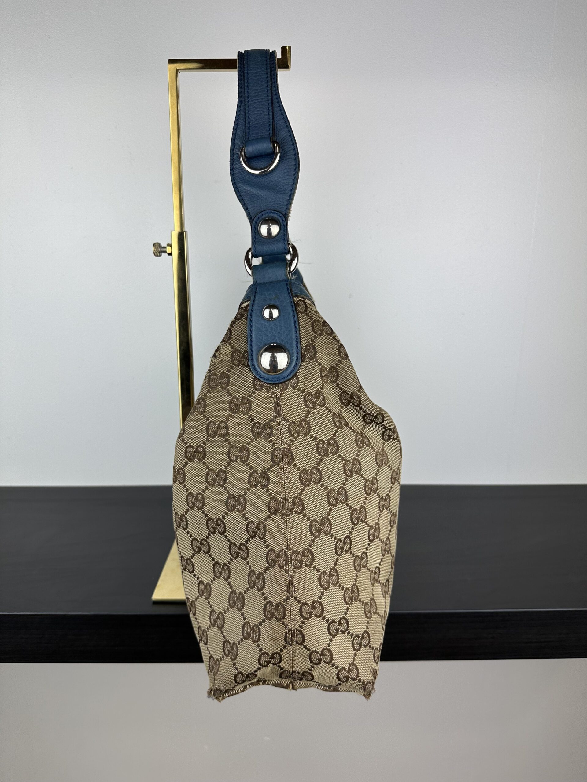 & Free ShippingBolso Gucci Hobo en lona GG canvas beige con detalles en piel azul.