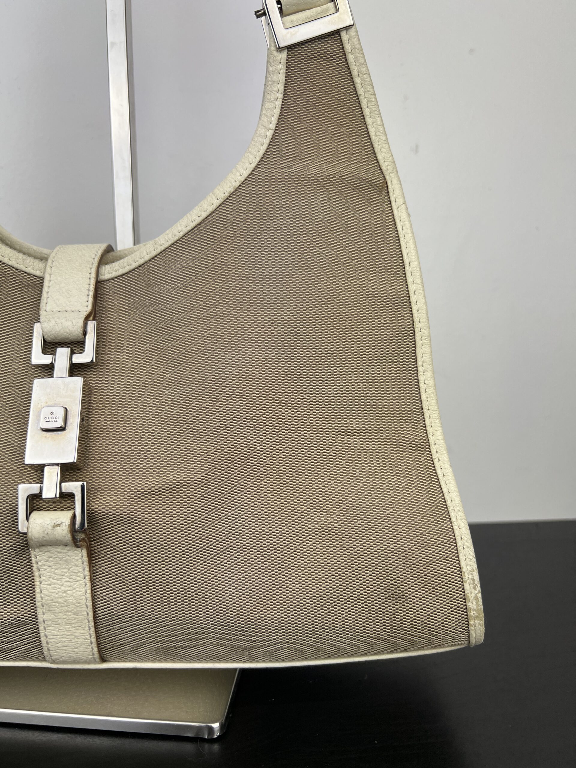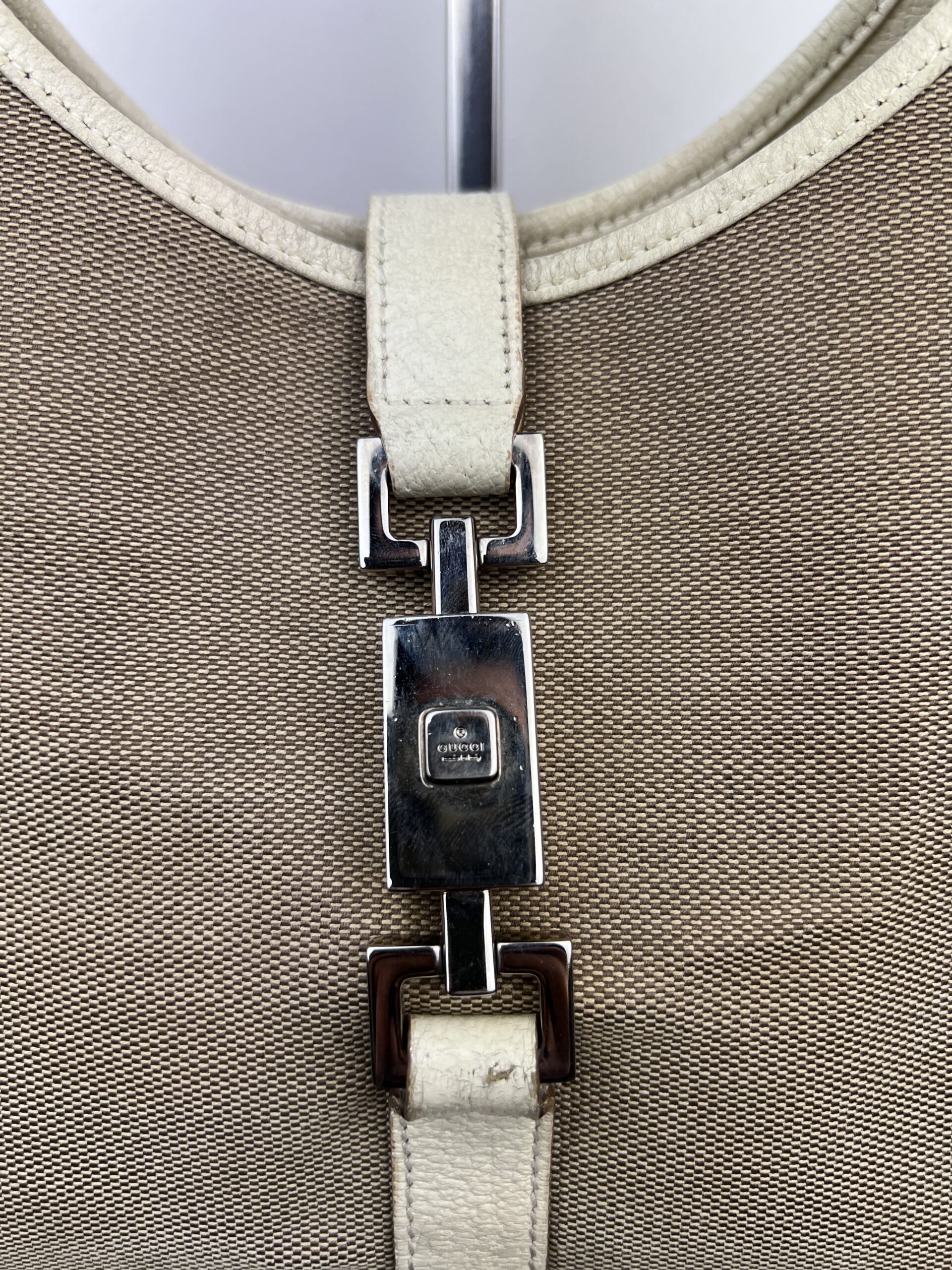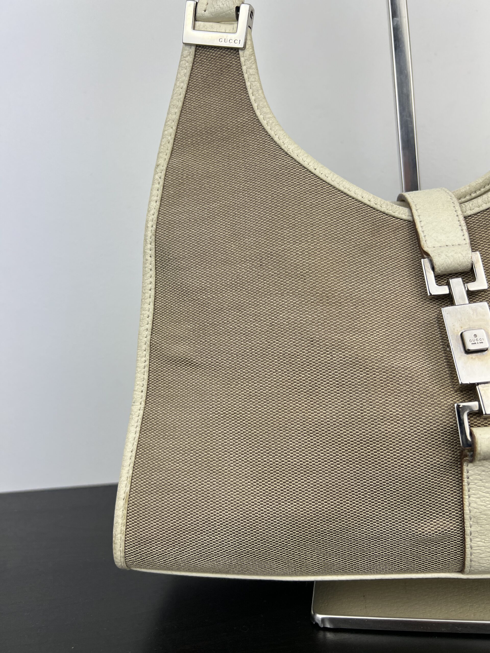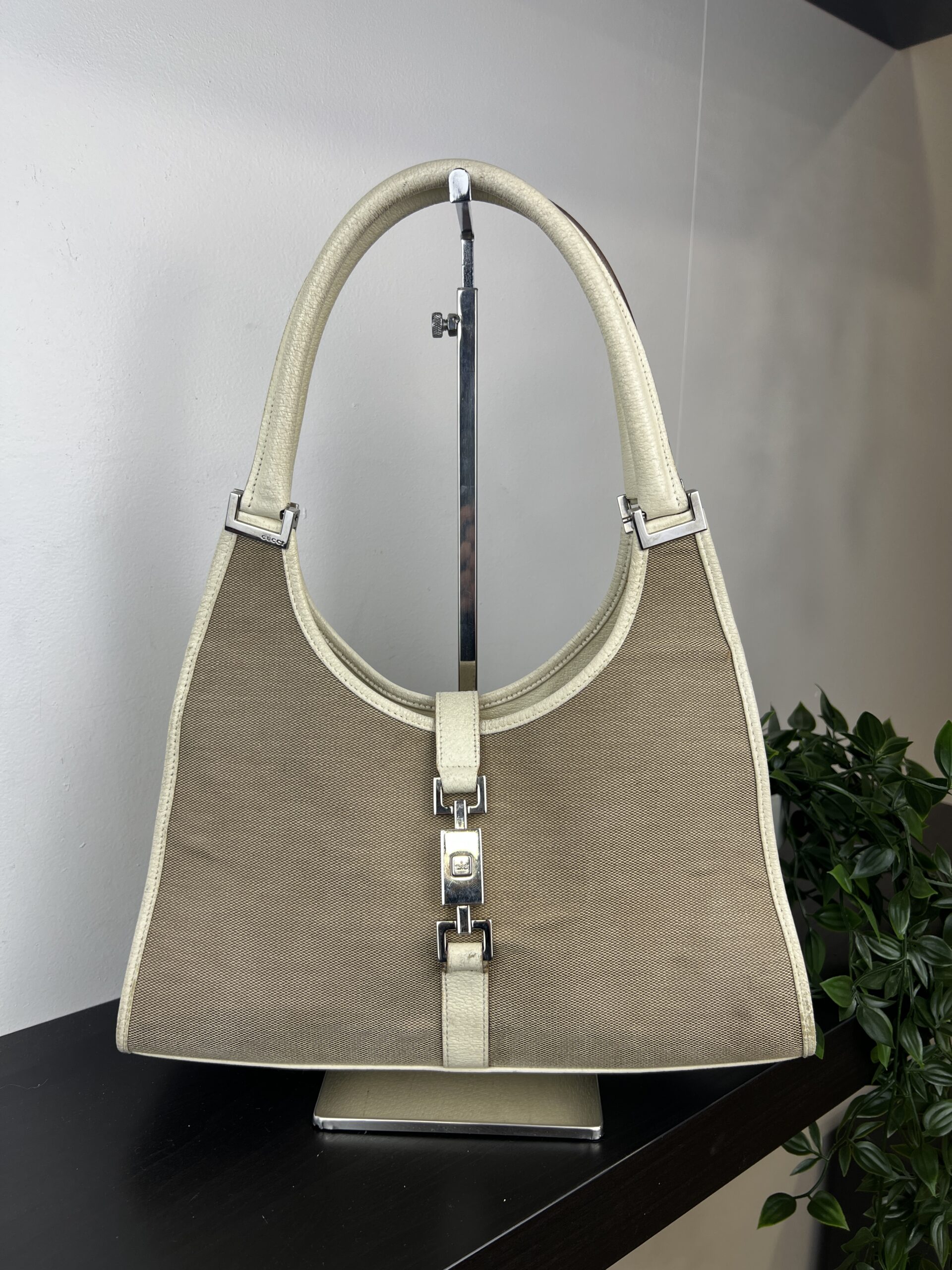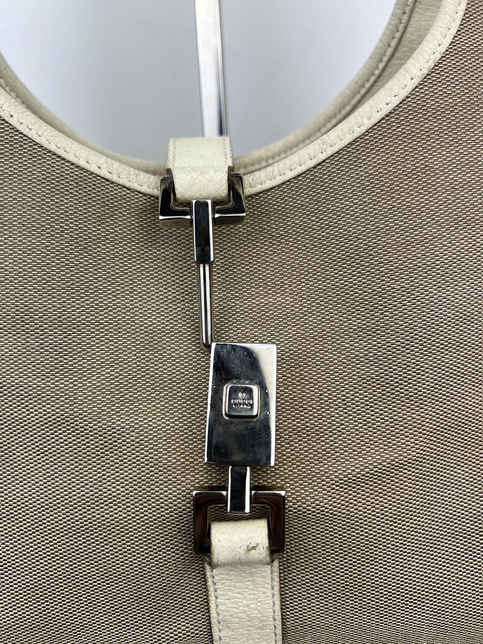 Bolso Gucci modelo Jackie confeccionado en lona beige con detalles en cuero color crema y herrajes metálicos plateados.