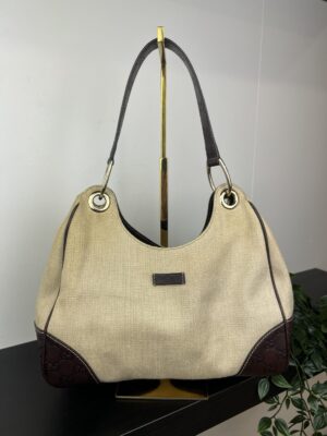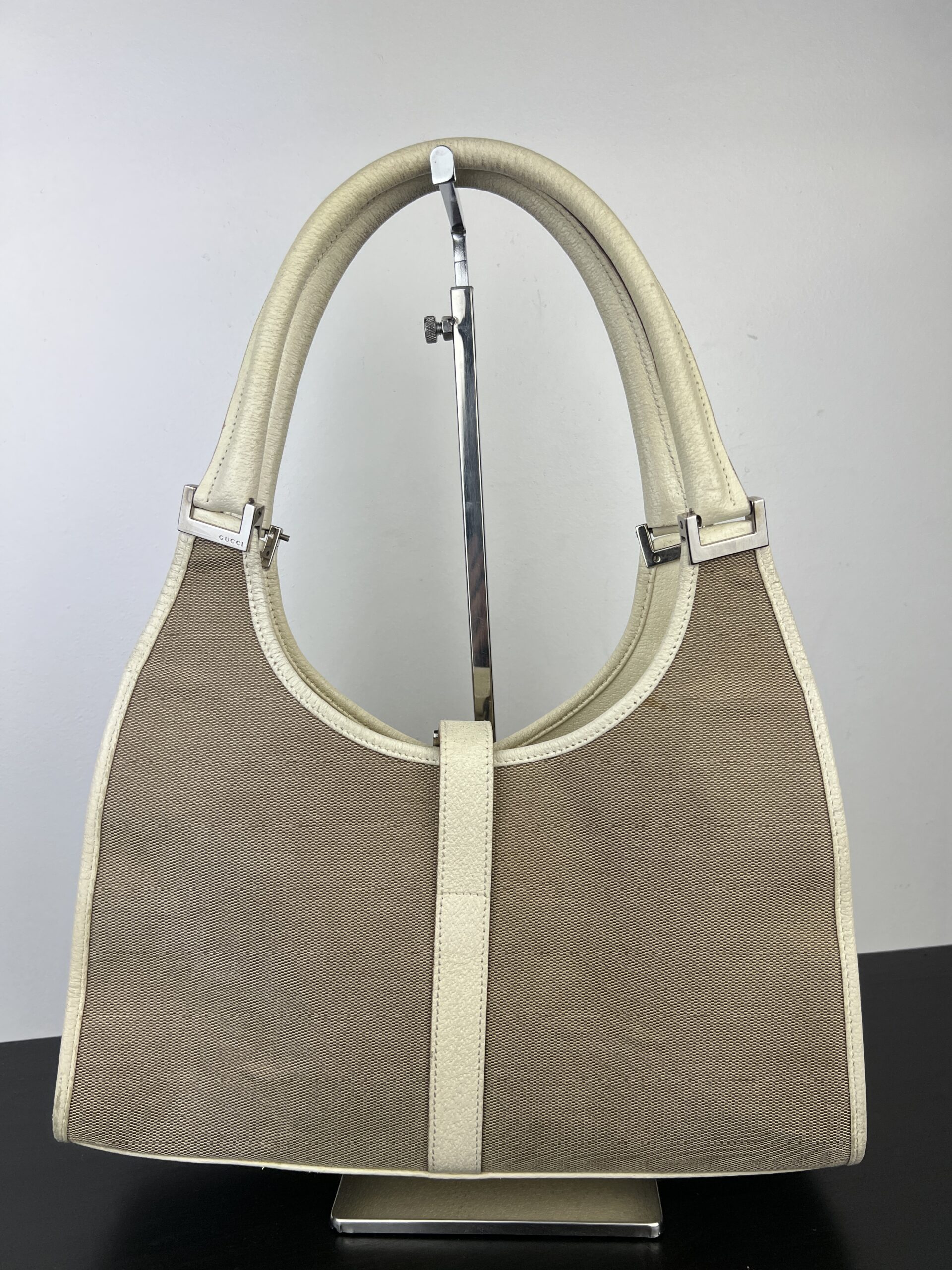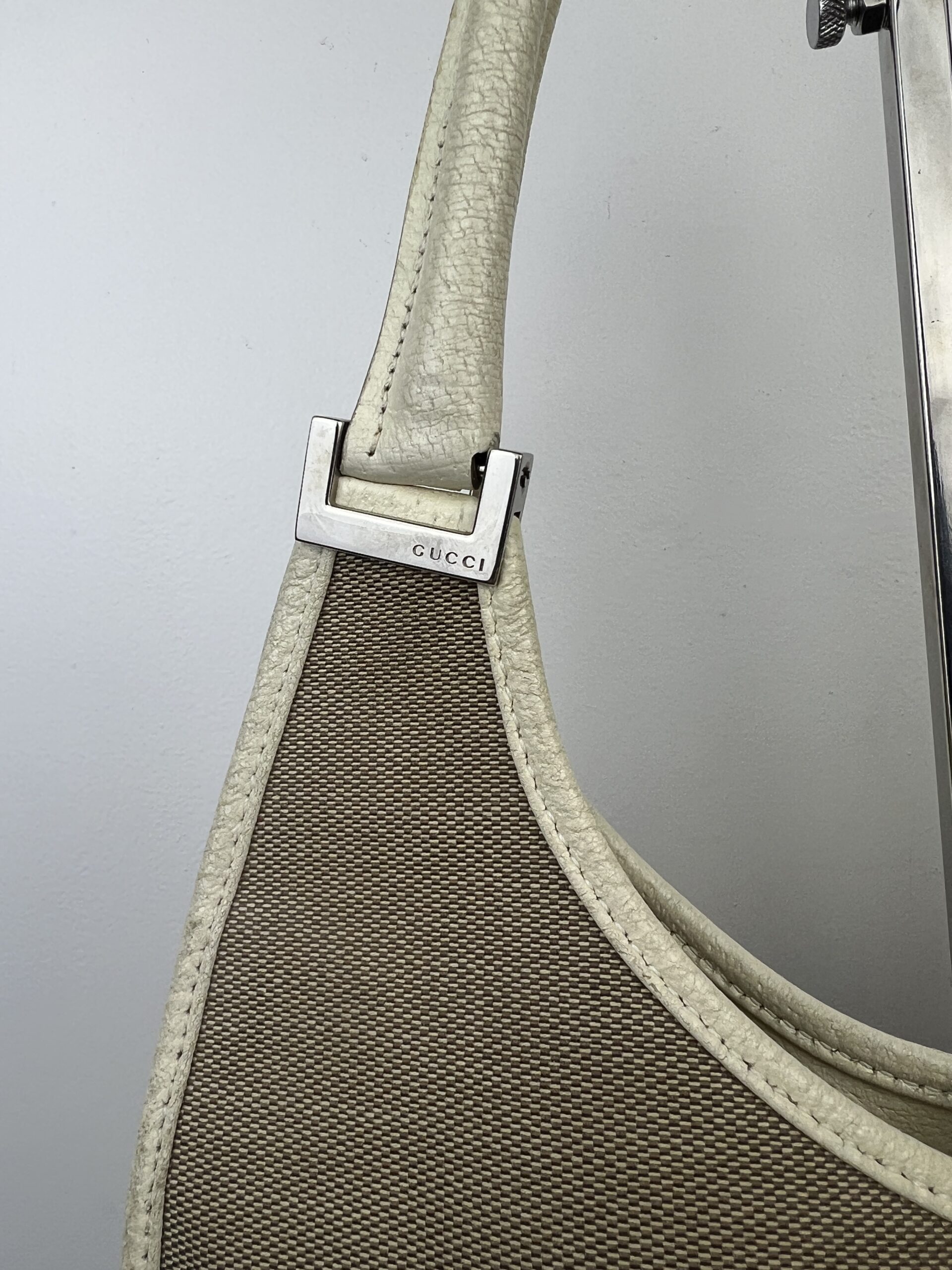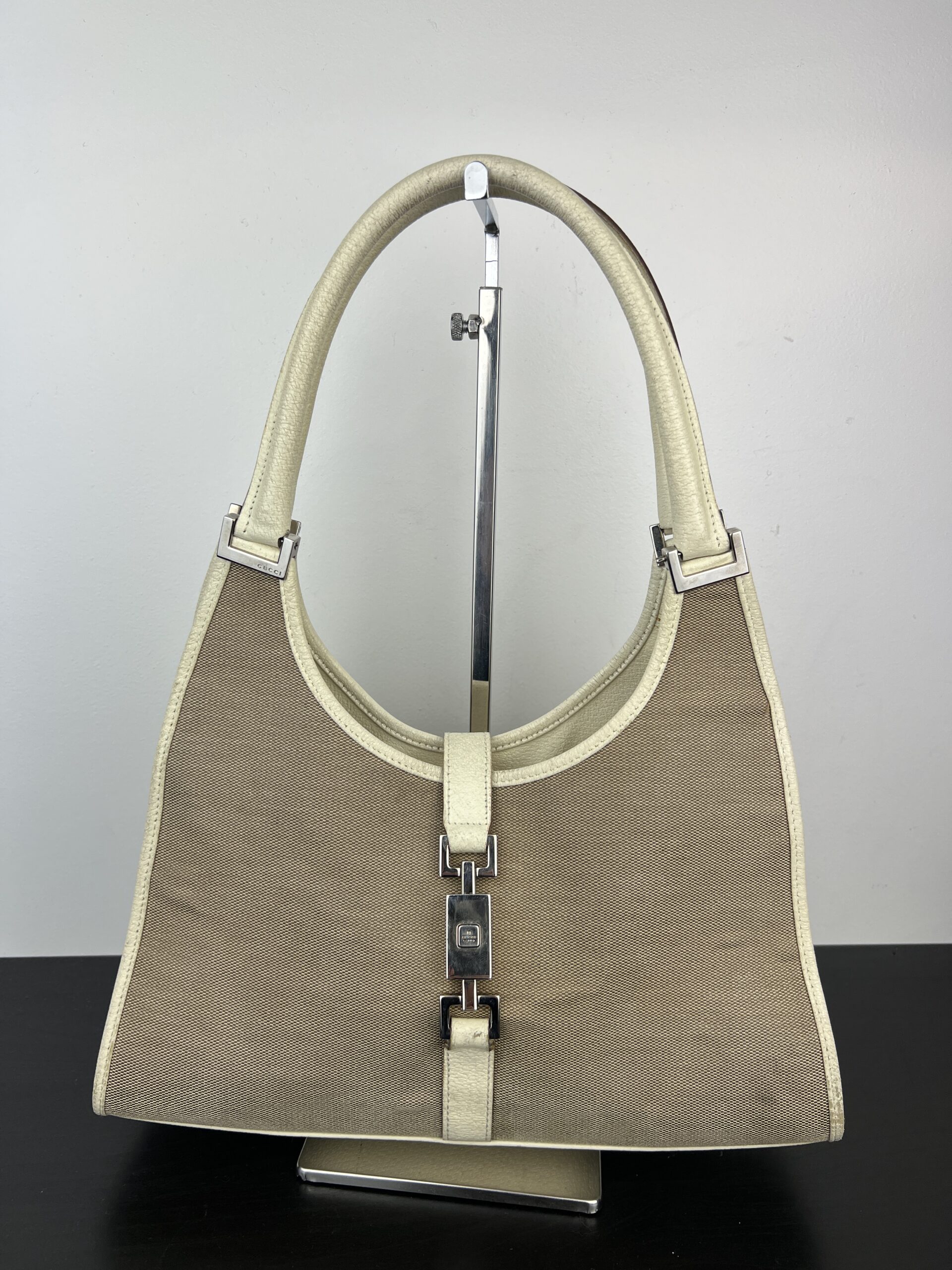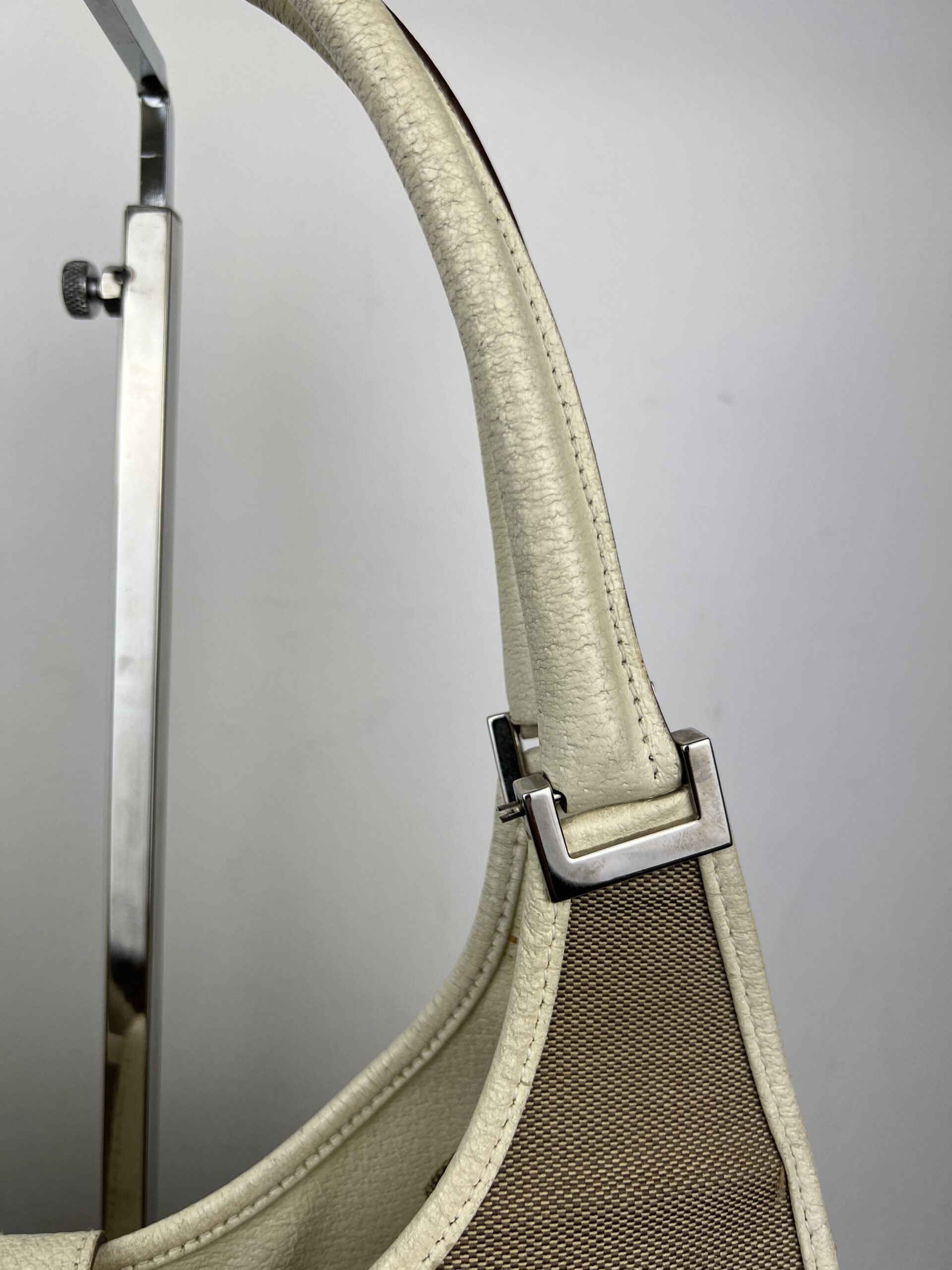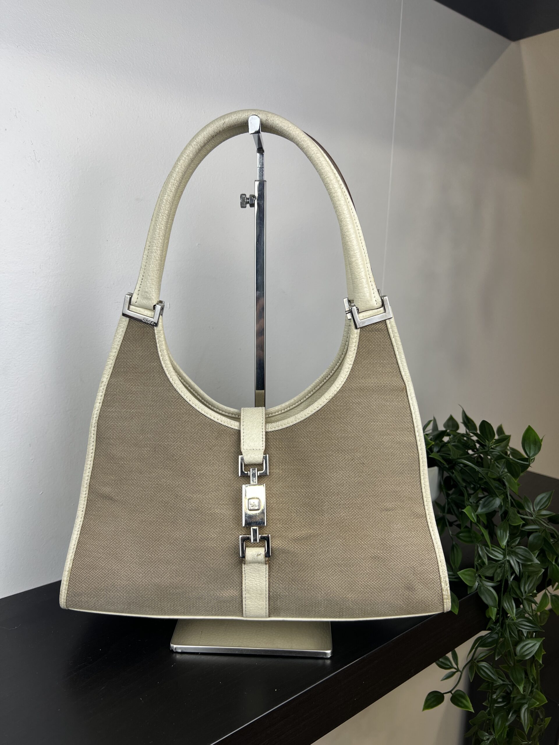 Bolso Gucci modelo Jackie confeccionado en lona beige con detalles en cuero color crema y herrajes metálicos plateados.